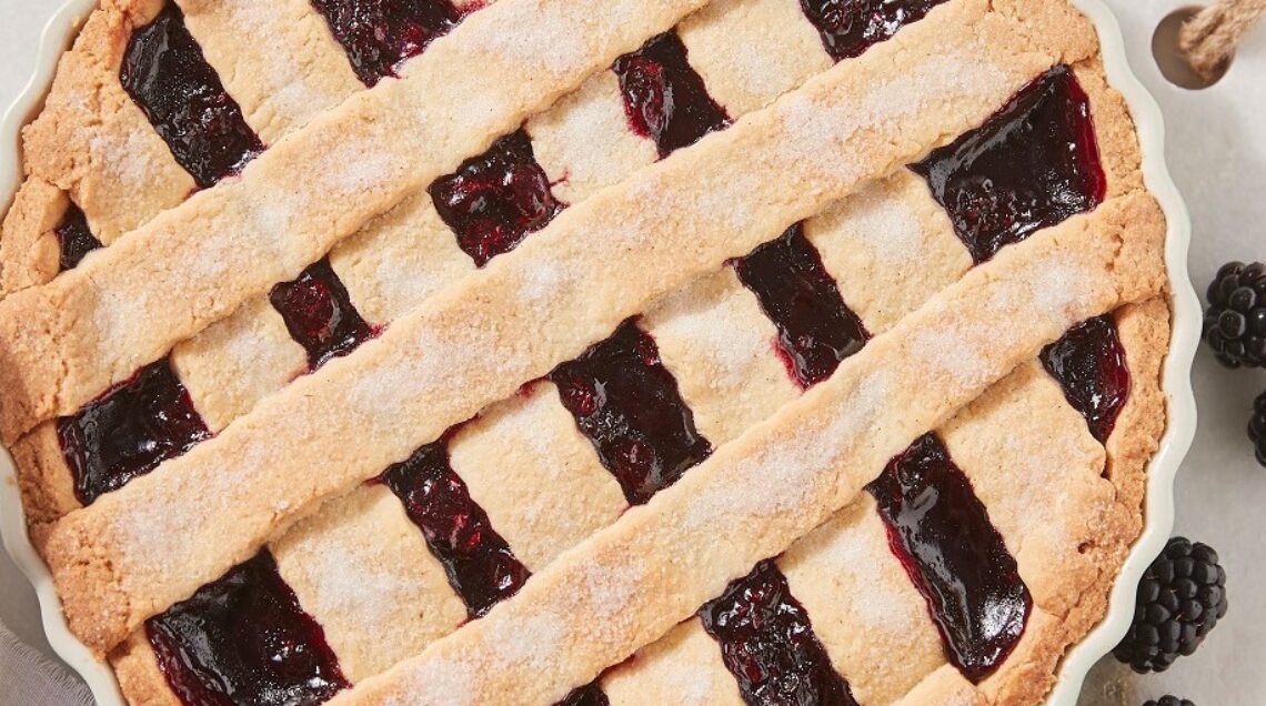 4) Stendete la pasta rimasta in una sfoglia sottile, ricavate delle strisce di 2 cm circa di larghezza e disponetele sulla confettura.Eliminate la pasta eccedente e cuocete a crostata nella parte bassa del forno preriscaldato a 180° per circa 45 minuti. Servitela fredda.