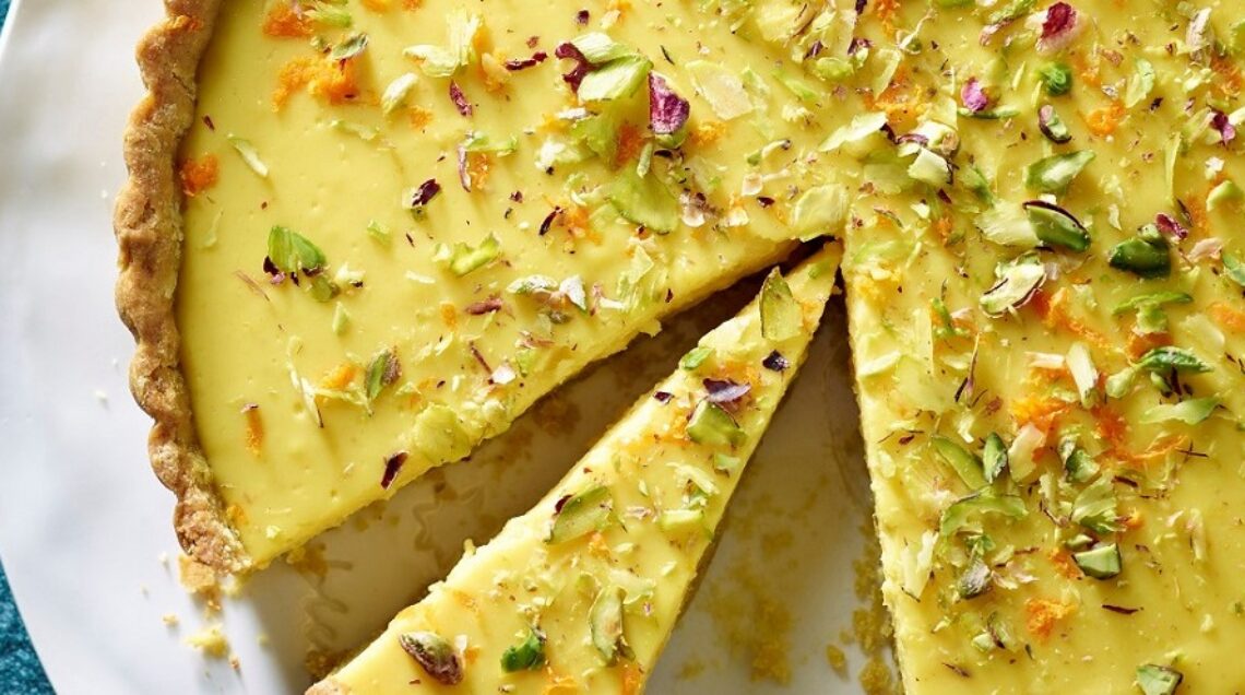 Una torta semplice, ma golosa, preparata con una base di frolla ai pistacchi fatta in casa e morbida crema a base di panna montata e zafferano. Il profumo dell'arancia permea guscio e farcia e guarnisce con leggere striscioline anche il dolce appena fatto.
