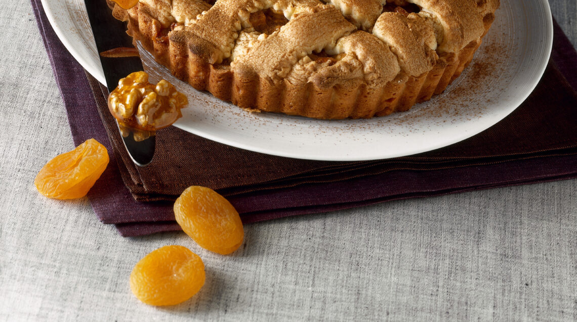 2) Togli dal fuoco, unisci le noci, le albicocche e il miele. Attendi un istante, aggiungi la panna e rimetti sul fuoco. Fai fondere il composto, mescolando in modo che i pezzi di frutta risultino ben separati; togli dal fuoco e lascia intiepidire. Imburra abbondantemente uno stampo da crostata con il fondo amovibile del diametro di 18-20 cm.