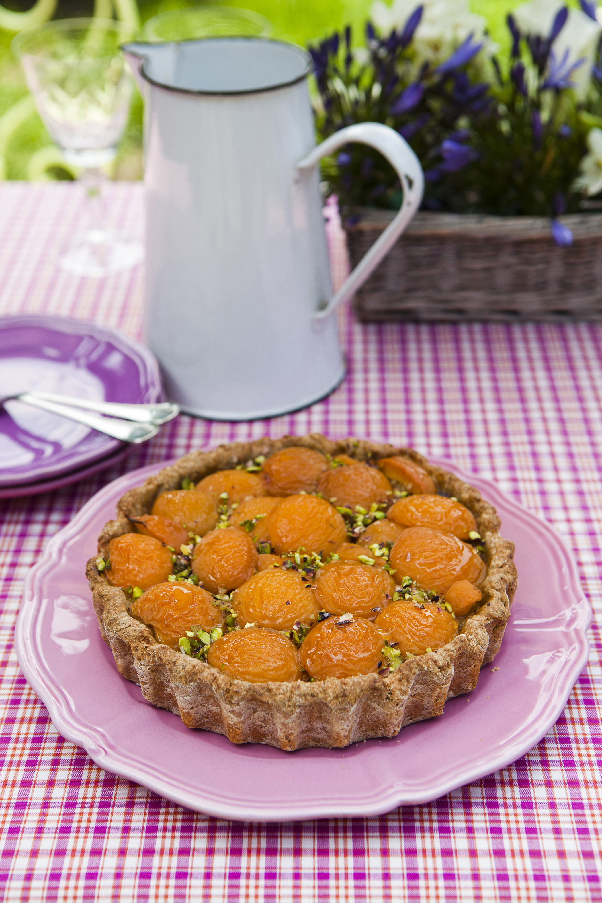 Togli la pasta dal frigorifero, trasferitela su un piano di lavoro infarinato e stendila con un matterello in un disco di 25 cm di diametro. Imburra e infarina uno stampo da crostata con bordo scannellato del diametro di 20-22 cm, poi fodera il fondo e le pareti con il disco di pasta preparato. Distribuisci il composto di mele sulla pasta e livellatelo con il dorso di un cucchiaio; adagia le albicocche tagliate a metà e provate del nocciolo e passa nel forno caldo a 180° per 40 minuti. Appena sfornata, guarnisci la crostata con i pistacchi tritati.