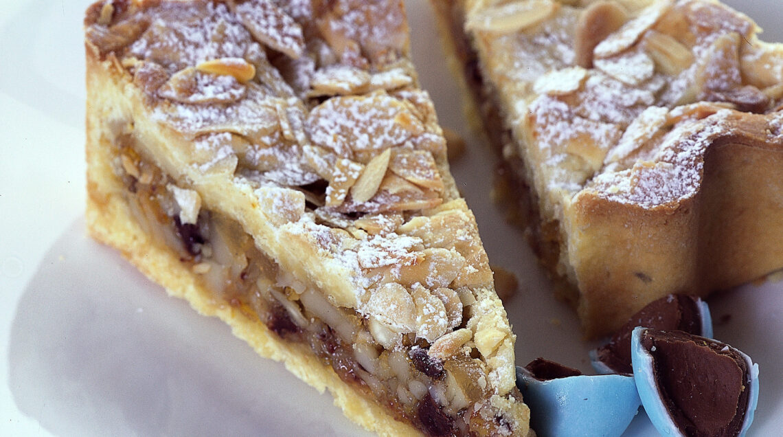 3) Versa nello stampo il composto di mandorle e livellalo. Impasta la frolla rimasta con le mandorle a lamelle, stendila, ricava tante strisce di 1,5 cm e disponile a grata sulla torta. Cuoci la torta nella parte bassa del forno caldo a 180° per 35 minuti. Servi la crostata mandorlata fredda e spolverizza di zucchero a velo.