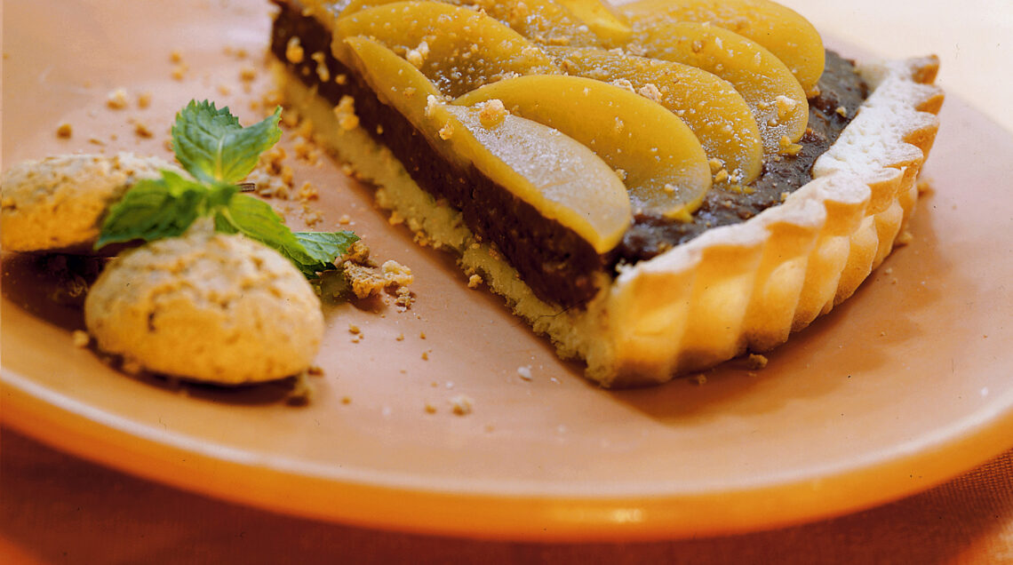 6) Infine decora la crostata di pesche e amaretti con un ciuffo di menta fresca e servila.