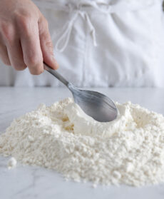 Setacciate la farina e lasciatela cadere direttamente sulla spianatoia, mescolatela insieme a 80 g di zucchero e formate una fontana; fate al centro un incavo e aggiungete la ricotta e un pizzico di sale.