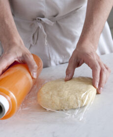 Formate un panetto con l'impasto ottenuto, avvolgetelo nella pellicola per alimenti e lasciatelo riposare per almeno 30 minuti in frigorifero. Ammorbidite le mandorle a lamelle, mettendole a bagno in una ciotola con acqua fredda.