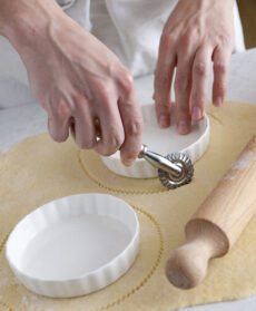 Trascorso il tempo di riposo, riprendete l'impasto, disponetelo sul piano di lavoro infarinato e stendete una larga sfoglia spessa 3 mm, aiutandovi con un mattarello. Imburrate 8 stampini da tartelletta del diametro di 10 cm, appoggiateli sulla sfoglia e ritagliate 8 dischi di pasta un po' più grandi della forma dello stampo. Disponete i dischi di sfoglia nei singoli stampi, foderando il fondo e i bordi. Eliminate l'eccedenza di pasta tagliandola con una rotella o un coltello e bucherellate il fondo con i rebbi di una forchetta.