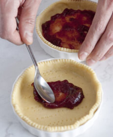 Versate circa 20 g di confettura di ribes in ciascuno dei gusci di sfoglia e spalmatela sul fondo.