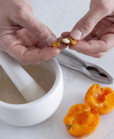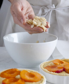 Lavate e asciugate le albicocche, tagliatele a metà ed eliminate i noccioli tenendone da parte uno. Rompete il nocciolo con uno schiaccianoci ed estraete la mandorlina interna, poi pelatela e pestatela in un mortaio con un cucchiaino di zucchero. Montate in una ciotola e con le fruste elettriche il burro a temperatura ambiente con lo zucchero rimasto fino a ottenere un composto spumoso; incorporate 100 g di mandorle in polvere, la mandorla pestata e i tuorli. Amalgamate bene tutti gli ingredienti fino a ottenere una crema frangipane omogenea e senza grumi.