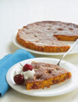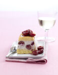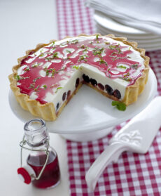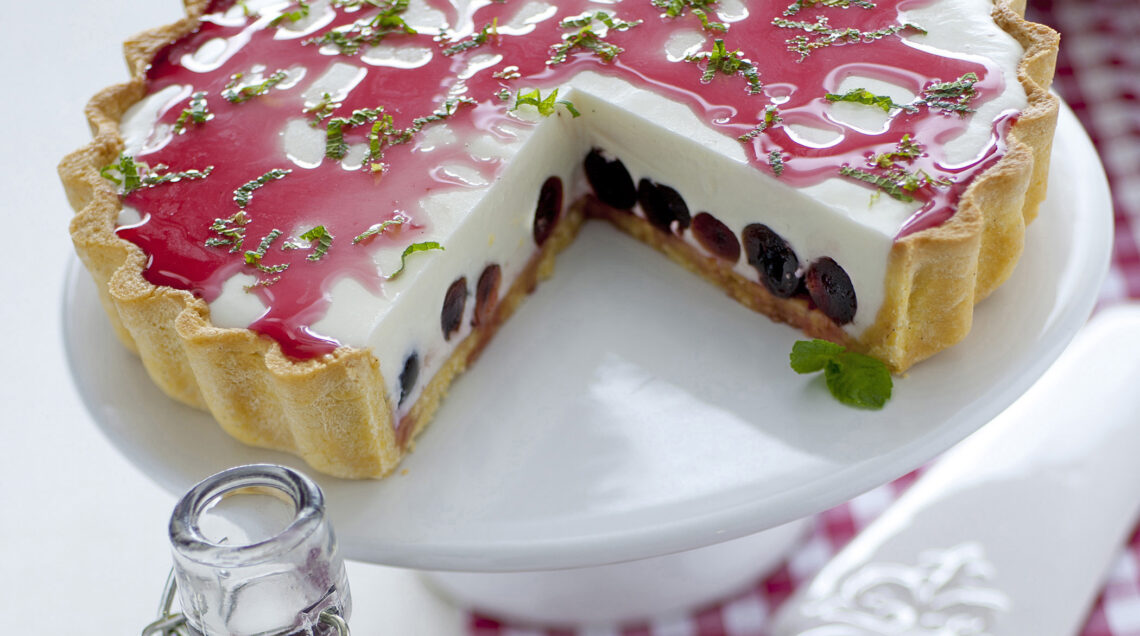 Prima di servire la torta con bavarese di yogurt e ciliegie irrora la superficie con lo sciroppo di ciliegie tenuto da parte (fatto prima addensare a fuoco basso) e profuma con foglioline di menta tagliate a listarelle.