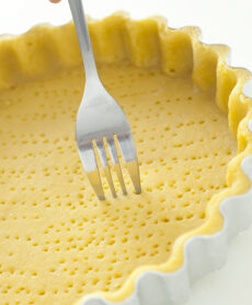 Stendi la frolla con il matterello a 1/2 cm di spessore e trasferiscila nello stampo imburrato. Bucherella il fondo e copri con alluminio e legumi secchi. Cuoci in forno già caldo a 180°C per 20-25 minuti. Elimina alluminio e legumi, cuoci per altri 5 minuti e sforna.