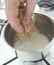 Prepara la farcia. Metti i fogli di gelatina in acqua fredda per 5 minuti. Lava le ciliegie, privale del picciolo e snocciolale con l'apposito snocciolatore. Mettile in una padella antiaderente, spolverizzale con 20 g di zucchero, bagnale con il succo di limone e cuoci per 2-3 minuti.