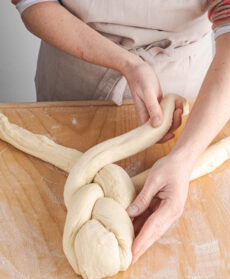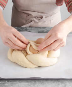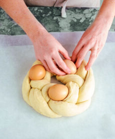 Piegate la treccia per formare una corona e sigillate le estremità. Sistematela su una placca ricoperta con carta da forno e adagiate in 3 anse della treccia le uova rimaste (con il guscio, lavate e asciugate). Formate sei cordoncini con la pasta tenuta da parte, metteteli a croce sulle uova e saldateli all'impasto.