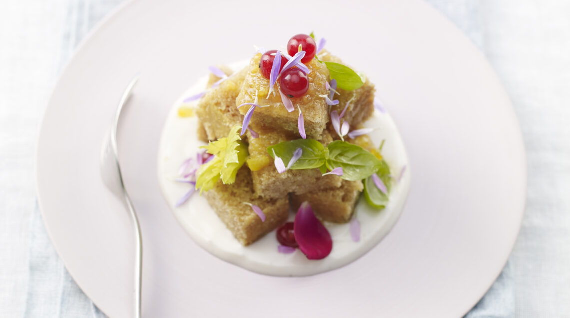 7) Adagia sopra la crema, in modo casuale, i dadi di pan di Spagna vegano. Decora con le erbe profumate, i fiori e il ribes rosso. Completa i piatti con qualche goccia di marmellata di arance amara allungata con poca acqua.