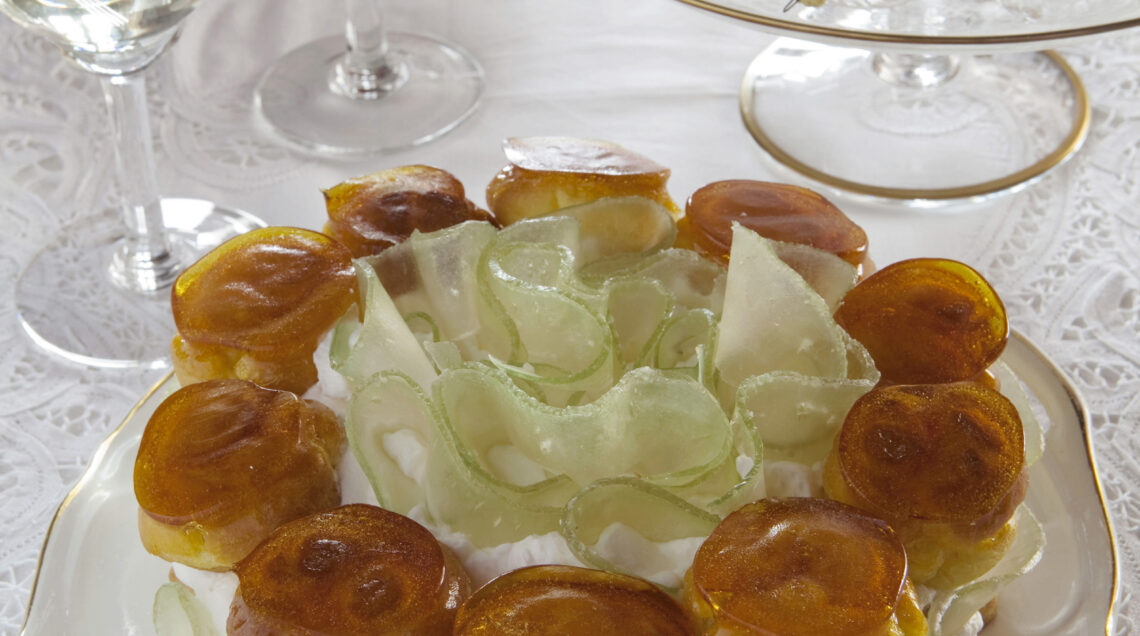 3 Cuocete lo zucchero rimasto con 3 cucchiai di acqua fino a ottenere un caramello ambrato. Levate dal fuoco, immergetevi la parte alta dei bignè, fateli raffreddare capovolti su carta da forno e farciteli con la panna al panettone. Spalmate un velo di panna montata sulla frolla, posatevi la fetta di panettone rimasta, coprite con il resto della panna, disponete i bignè tutto attorno e decorate con il cedro candito a lamelle.