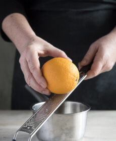Preparate la crema, versate il succo di arancia e 60 g di zucchero in una casseruola, unite la scorza di arancia grattugiata e portate a ebollizione.