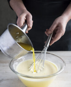 Mettete a bagno la gelatina in acqua tiepida. Preparate la base, montate 100 g di burro fino a ottenere una consistenza a pomata, unite lo zucchero a velo e mescolate.