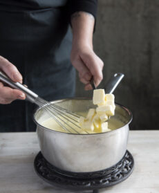 Trasferite il composto in una casseruola, portate la crema al limite dell'ebollizione mescolando con una frusta, poi togliete la casseruola dal fuoco, unite la gelatina scolata e strizzata e 120 g di burro a fiocchetti e mescolate fino a che si è sciolto.