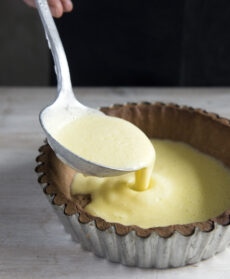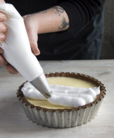 Trasferitela in una tasca da pasticciere con la bocchetta liscia di 1,5 cm e disponetela sulla crema. Bruciate la meringa con un cannello o sotto il grill del forno e servite.