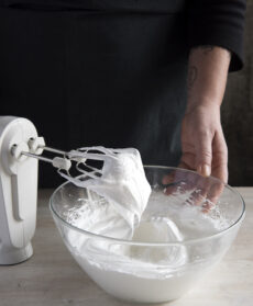 Preparate la meringa, montate gli albumi con 75 g di zucchero e quando iniziano a essere spumosi unite poco alla volta altri 75 g di zucchero e continuate a montare fino a ottenere una meringa lucida e soda.