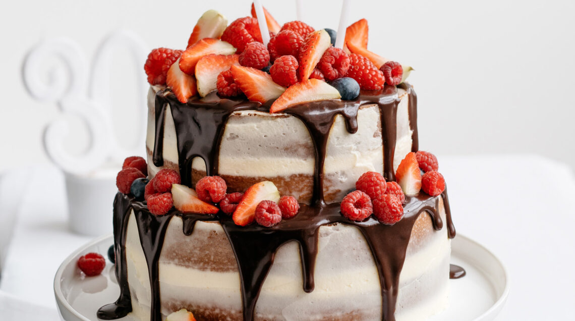 4) Lavora a pomata il burro rimasto, quindi montalo con le fruste insieme ad un po’ di zucchero a velo per renderlo spumoso. Aggiungi via via tutto lo zucchero a velo e poi il formaggio spalmabile. Taglia le due torte a metà in senso orizzontale e farciscile con 2 terzi della crema al formaggio: premi un po’ e spatola sui bordi la crema eccedente. Copri anche la superficie delle basi con la crema rimasta. Sistema la base più larga su un piatto da portata e versaci sopra un po’ più di metà della salsa al cioccolato, facendola colare lungo i bordi. Impila la seconda torta sulla prima e versa su di essa il resto della salsa. Completa con i frutti di bosco (fragole, mirtilli, lamponi). Servi la torta al tè con salsa di cioccolato e frutti rossi.