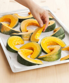 Tagliate la zucca a fette senza sbucciarla, eliminando semi e filamenti, sistemate le fette su una placca foderata con carta da forno, infornate a 180° e cuocete per 50-60 minuti, finché, infilzandola con uno stecchino, la polpa risulterà morbida.
