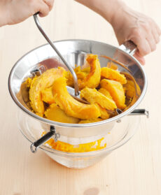 Sfornate la zucca, lasciatela intiepidire, eliminate la scorza e tagliate la polpa a pezzi; passatela al passaverdure a cui avrete applicato il disco più fine, raccogliendo il passato in una capiente ciotola: dovrete ottenere circa 500 g di composto.
