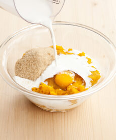 Aggiungete al passato di zucca lo zucchero, le uova e la panna; mescolate bene fino a ottenere un composto amalgamato, aggiungete mezzo cucchiaino di cannella, un pizzico di chiodi di garofano e lo zenzero fresco grattugiato; continuate a mescolare.
