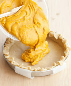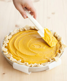 Ora potete farcire la torta. Stendete la pasta allo spessore di circa mezzo cm. Incrociate sul fondo della tortiera imburrata 3 strisce di carta da forno facendole sbordare, foderatela con la pasta, eliminate quella in eccesso e guarnite i bordi a piacere; versate al centro il composto di zucca.