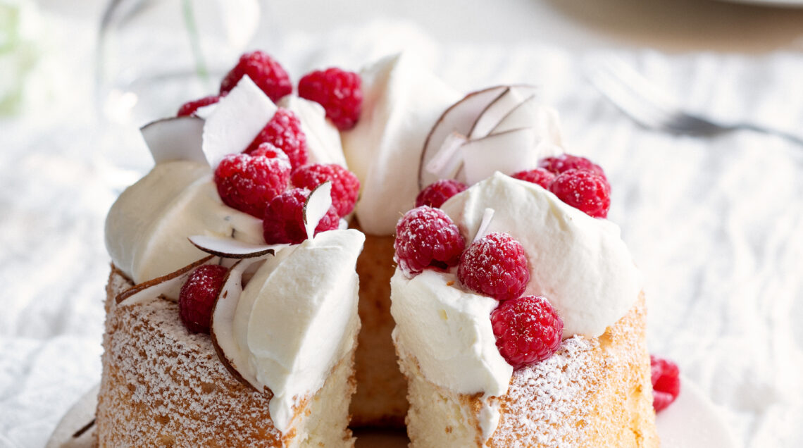 Un impasto leggero e soffice come una nuvola, decorato con panna e mascarpone e guarnito con cocco e lamponi. Un dolce perfetto da regalare alla mamma