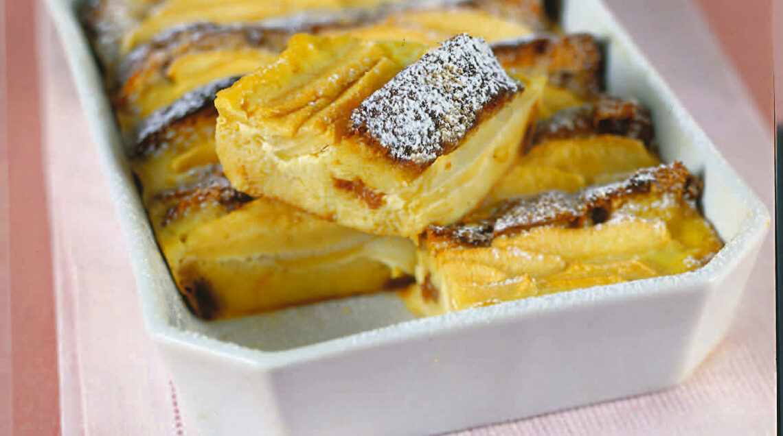 1) Prendi del panettone, taglialo a fette dello spessore di 2 centimetri e usale per foderare il fondo di una di 17x27 centimetri a bordi alti che hai precedentemente imburrato. Continua a realizzare la ricetta del budino di panettone e mele bagnando le fette con il liquore e adagiando su di essere le mele prima sbucciate e poi tagliate a fette.