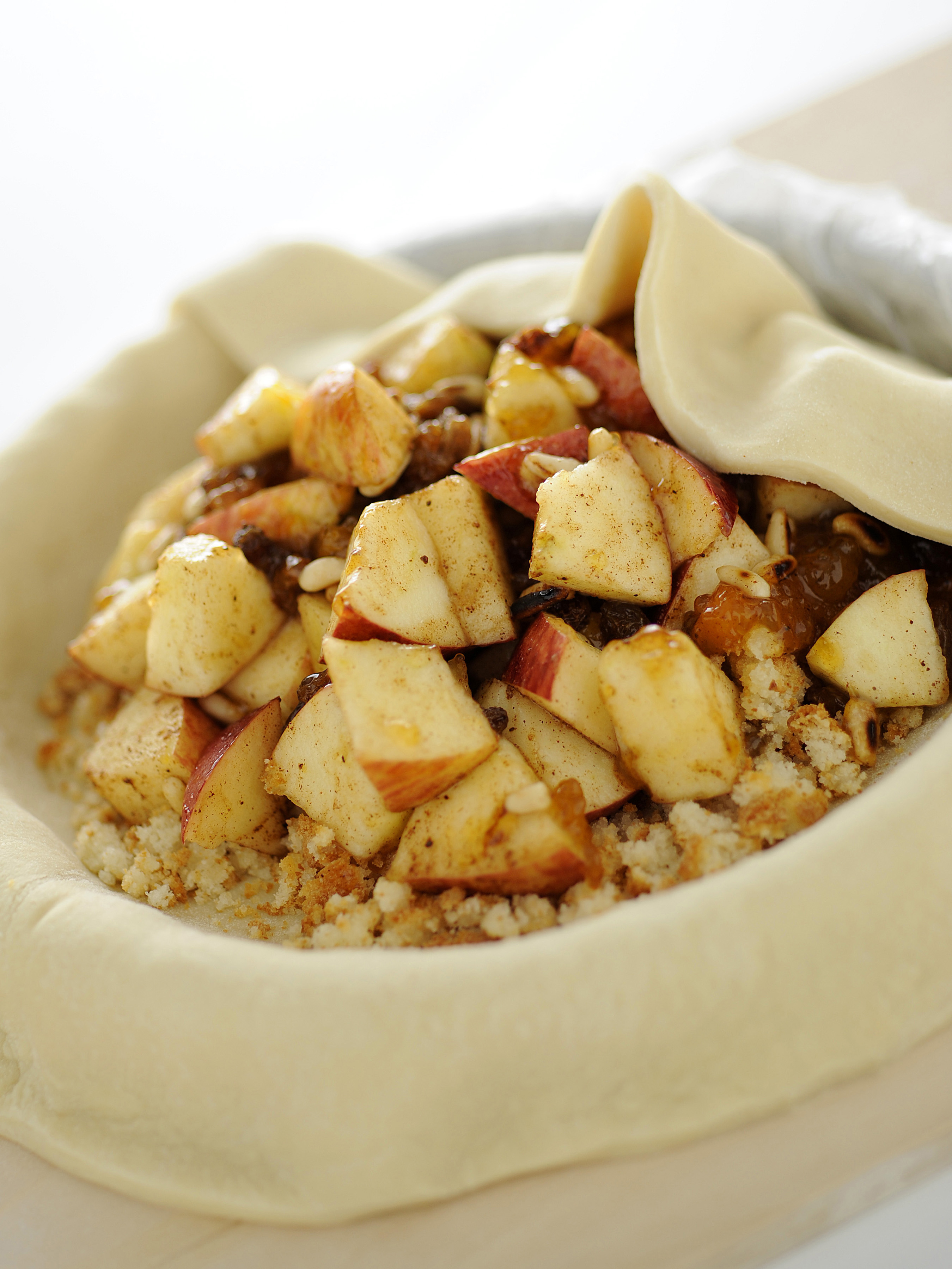 1) Metti in un piatto ½ bicchiere di rum, poi sistemaci l’uvetta ad ammorbidire. Intanto tosta i pinoli, lava le mele e tagliale a tocchetti e poi mescolale insieme a 30 grammi di zucchero semolato, agli amaretti sbriciolati, all'uvetta scolata e strizzata, al burro fuso, ai pinoli tostati e infine alle spezie.