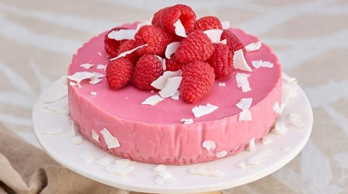 4 Versate il composto ottenuto nello stampo sopra la base croccante al cacao. Trasferite in frigorifero per almeno 5-6 ore prima di servire. Guarnite il dolce con i lamponi tenuti da parte e, a piacere, scagliette di cocco fresco.