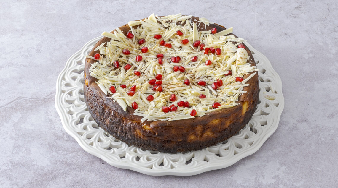 La croccante base di frollini e amaretti è ricoperta da una soffice crema di doppio formaggio e cioccolato bianco. La cottura in forno, il raffreddamento e il riposo in frigorifero ne fanno una piccola opera d’arte, decorata con una pioggia di chicchi portafortuna e profumata alla cannella.