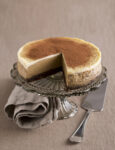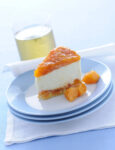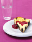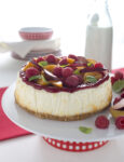 3) Togli la cheesecake dal forno, lascia raffreddare, poi sforma su un piatto per dolci. Monta la panna con lo zucchero a velo, distribuiscila sulla superficie del dolce livellandola con una spatola, guarnisci con le ciliegie intere tenute da parte e le foglioline di menta e versa sopra, a filo, un cucchiaio di confettura sciolta a bagnomaria.