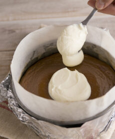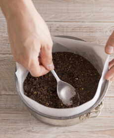 Rivestite con carta da forno uno stampo del diametro di 18 cm con il bordo a cerniera apribile. Versate sul fondo il composto di biscotti e compattatelo con il dorso di un cucchiaio.