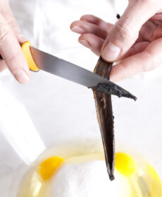 Riunite in una ciotola le uova con lo zucchero semolato, unite i semini contenuti nel baccello di vaniglia e mescolate finché lo zucchero è sciolto.