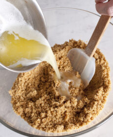 Spezzettate i biscotti e tritateli finemente nel mixer. Sciogliete il burro su fiamma bassissima e unitelo ai biscotti mescolando con una spatola.
