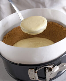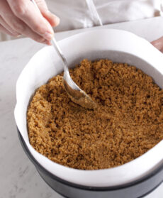 Rivestite di carta da forno il fondo e i bordi di uno stampo a cerniera di 22 cm di diametro e versatevi il composto di biscotti cercando di distribuirlo uniformemente sul fondo e vicino ai bordi. Premete i biscotti con il dorso di un cucchiaio, prima sul fondo e poi sui bordi in modo da ottenere uno strato ben compatto e uno spessore omogeneo. Mettete lo stampo in frigorifero per 30 minuti.