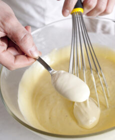 Aggiungete il formaggio fresco e mescolate con una frusta per incorporarlo. Unite metà della panna acida e amalgamate gli ingredienti con la frusta.