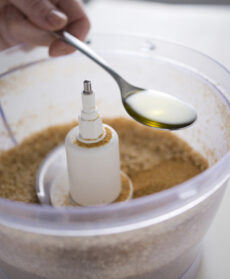 1) Prepara la base della torta. Trita al mixer le fette biscottate e le noci, quindi aggiungi lo zucchero e l'olio. Frulla ancora, fino a ottenere un composto omogeneo; fodera lo stampo da forno con carta da forno bagnata e strizzata e versaci il composto preparato. Quindi trasferisci lo stampo in forno già caldo a 160 per circa 10 minuti: quando il composto sarà diventato dorato, togli lo stampo dal forno e lascia riposare la base a temperatura ambiente per almeno 30 minuti.