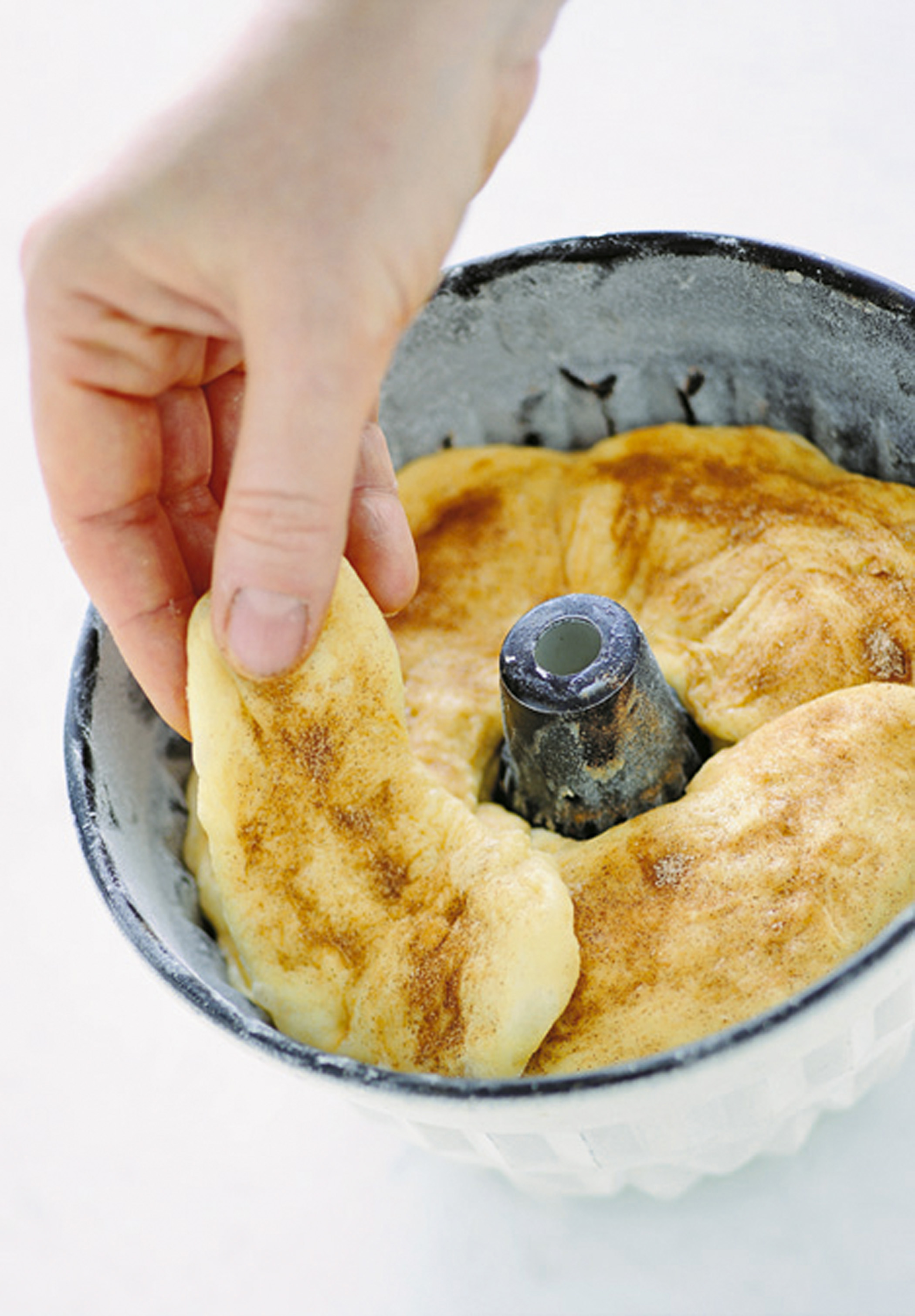 1) Riprendi l’impasto, dividilo in panetti e stendili in strisce dello spessore di circa ½ centimetro: cospargile con un pizzico di cannella mescolata con lo zucchero rimasto. Adagiale poi nello stampo, fino a quando non è pieno.