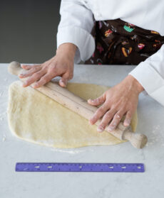 Prendete il mix di farina e lievito, unite le uova, uno alla volta, e il sale e lavoratelo fino a ottenere un impasto omogeneo e lasciatelo lievitare per 2 ore. Quindi stendetelo sul piano infarinato in un rettangolo di 30x25 cm e spesso circa 1 cm.