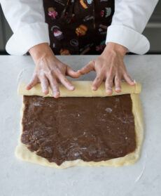 Preparate la farcitura: lavorate lo zucchero di canna (meglio il tipo muscovado) e la cannella in una ciotola con il burro morbido e la farina fino a ottenere una crema liscia e omogenea. Stendetela tra 2 fogli di carta da forno in una sfoglia spessa 4-5 mm e tenetela in freezer finché sarà congelata.