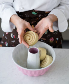 Eliminate la pellicola e tagliate il rotolo a rondelle spesse 3 cm circa, disponetele lungo i bordi di uno stampo a ciambella imburrato e cosparso con zucchero a velo e lasciatele lievitare per 1 ora, spennellandole man mano con il tuorlo sbattuto con la panna. Cuocete infine in forno a 160° per 30 minuti. Sformate la ciambella e servitela tiepida.