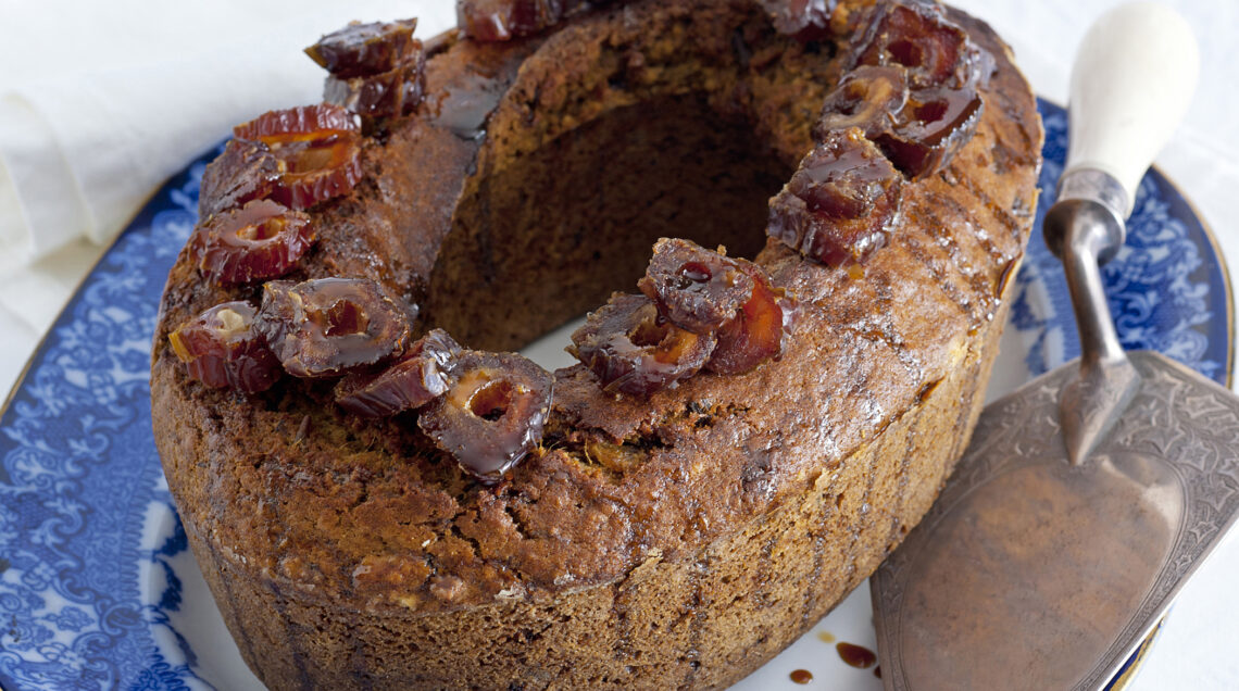 3) Decorala con i 2 datteri denocciolati tenuti da parte che devi tagliare a fette sottili e qualche cucchiaio di miele di castagno: gusta subito la tua ciambella ai datteri.