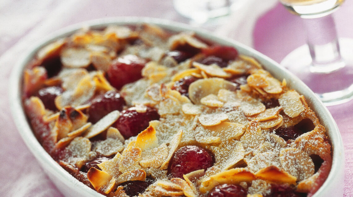 4) Quando la superficie è dorata e gonfia, estrai dal forno il dolce e spolverizza di zucchero a velo. Gusta insieme ai tuoi ospiti il clafoutis tiepido alle mandorle.