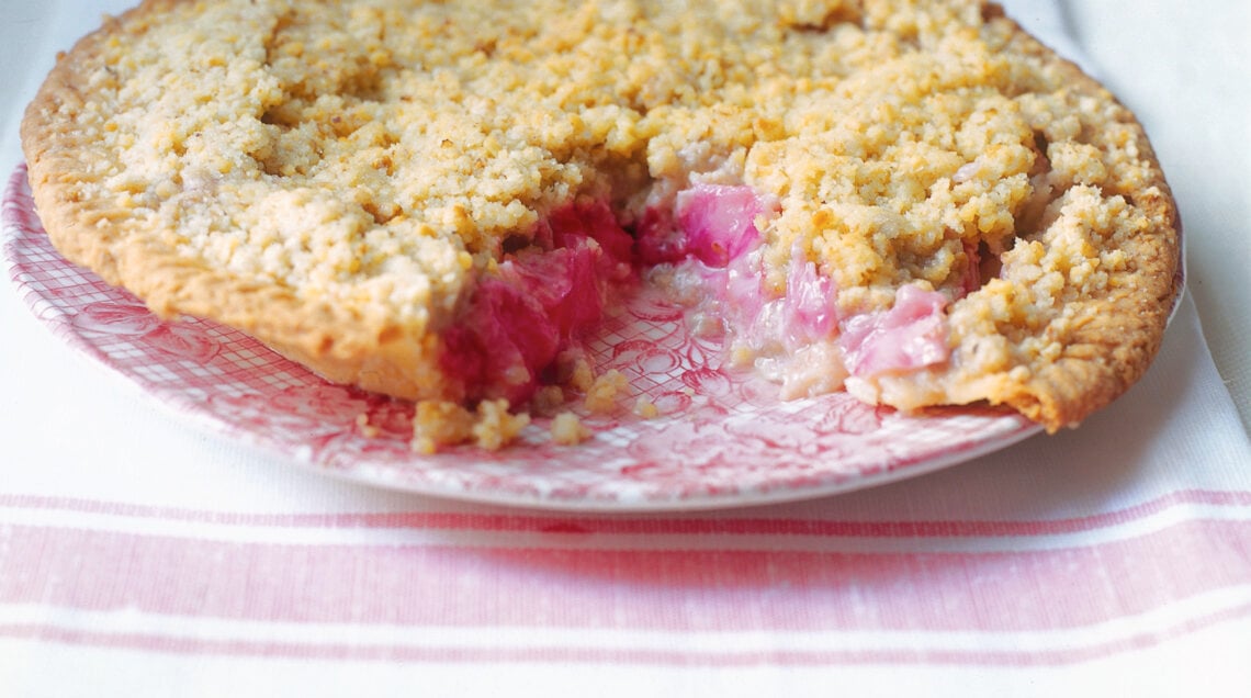 2) Taglia a tocchetti il rabarbaro e versalo in una ciotola. Aggiungi 3 cucchiai di farina e 100 g di zucchero e mescola il tutto. Versa il composto sulla base di pasta già cotta e versaci sopra l’impasto granuloso del crumble.