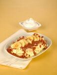 1) Sbuccia le banane, tagliatele a metà nel senso della lunghezza e poi a tocchetti trasversalmente e bagnali con il succo del limone per evitare che anneriscano. Sciogli 20 g di burro in una padella antiaderente, unisci le banane, le mandorle tritate e 30 g di zucchero e cuocile su fiamma vivace fino a che iniziano a caramellare. Spegni e lascia raffreddare.