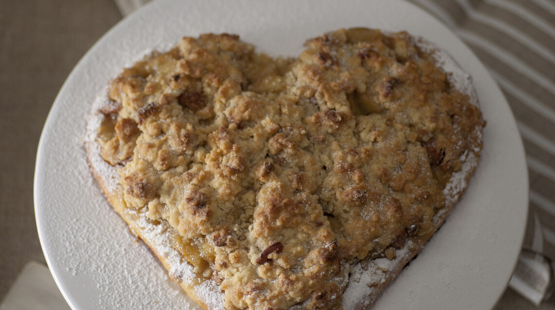 2) Stendi la pasta da pane in una sfoglia di 2 cm di spessore, trasferiscila su una teglia rivestita con carta da forno e tagliala a forma di cuore. Lasciala lievitare coperta in luogo tiepido per circa un'ora. Spennellala con l'uovo leggermente sbattuto, bucherellala al centro e fino a 3 cm dal bordo e coprila con le banane caramellate.