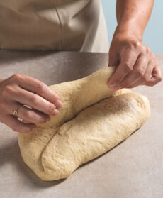 Allargate la pasta su un piano di lavoro, piegate i lembi verso il centro sovrapponendoli e quindi chiudete il panetto a portafoglio. Premetelo e tiratelo un poco e ripetete i giri di pieghe più volte finché l'impasto sarà elastico e non tenderà più a strapparsi.