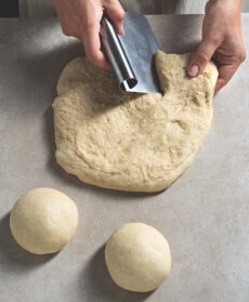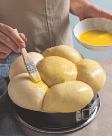 Adagiate la pasta sul piano di lavoro, dividetela in 6 parti uguali e formate altrettante palline. Imburrate una tortiera a cerniera di 26 cm di diametro e disponete 5 palline lungo il bordo e una al centro. Coprite con pellicola e lasciate lievitare fino al raddoppio del volume (1-2 ore).